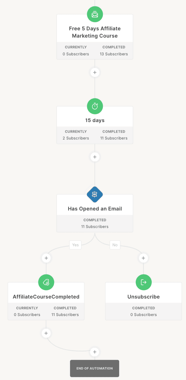 - Sur le côté gauche, il me montre les personnes qui ont terminé la série d’e-mails, ainsi que le taux d’ouverture total, les abonnés, les clics, etc.