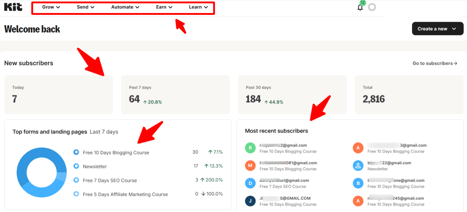 Comme vous pouvez le voir ci-dessus, le tableau de bord intuitif de Kit fournit un aperçu clair de mes campagnes d’e-mailing, de mes principaux formulaires et pages de destination, de mes abonnés et d’autres analyses.
