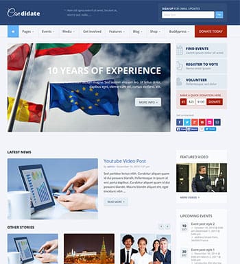 Candidate est un thème WordPress sérieux et professionnel, propre et vierge, poli et intuitivement structuré, avec une navigation intuitive et optimisée, convivial pour les utilisateurs et les développeurs, ambitieux et responsive, fonctionnellement polyvalent et très fiable, qui vous aidera à créer un site web de politicien, mais grâce à une mise en page flexible et dynamique il pourra aussi servir dans la création d’un site web pour une organisation à but non lucratif.