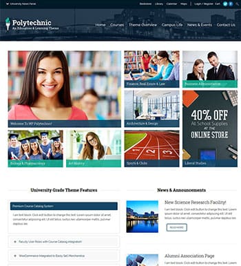 Polytechnic est un thème WordPress moderne et professionnel spécialement conçu pour des universités, facultés et toute autre formation de l’enseignement supérieure. Mais grâce à sa mise en page flexible et polyvalente, il conviendrait aussi à tout autre site web. Doté d’un design parfait et d’une mise en page professionnelle, vous aurez la possibilité de modifier cette dernière et d’en créer d’autres grâce à une intégration parfaite avec le plugin Visual Composer.