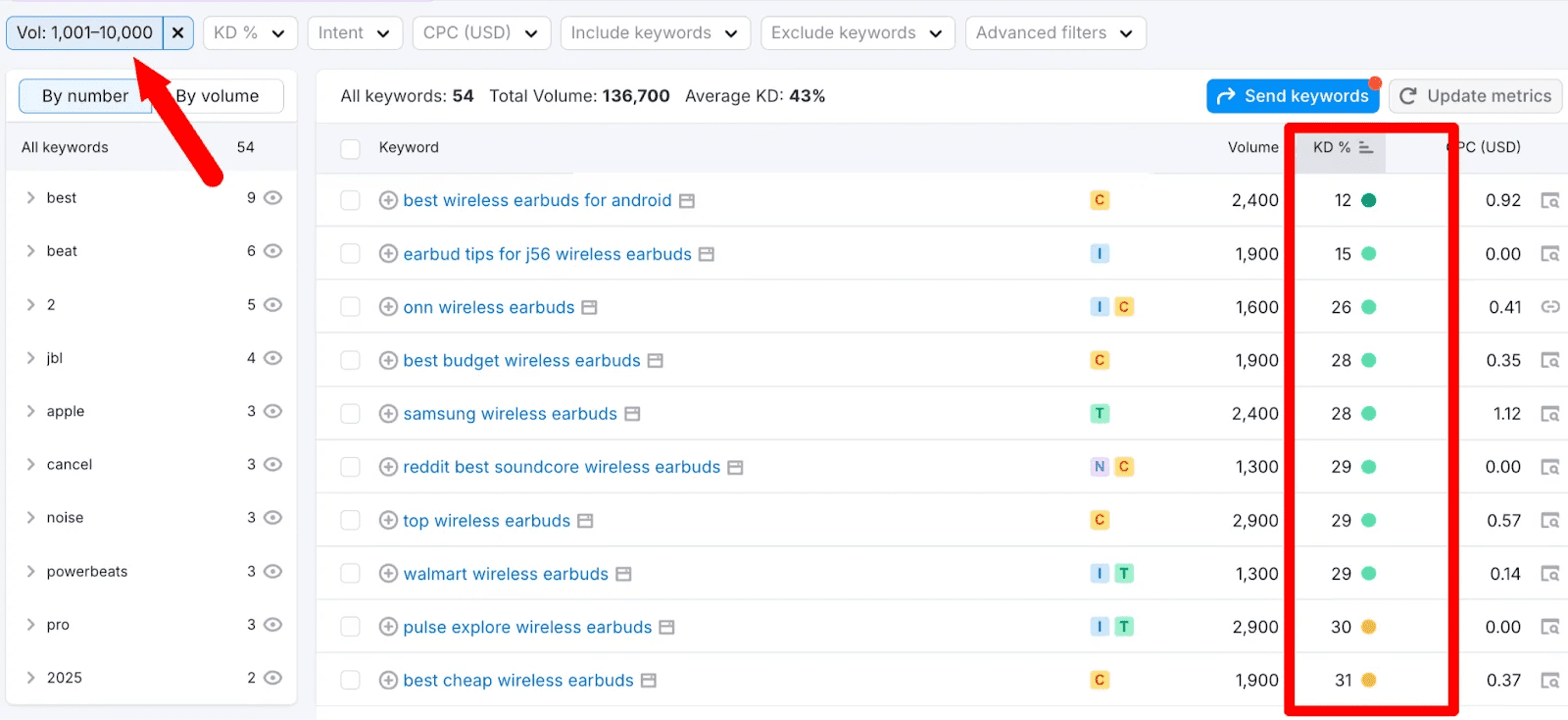 Maintenant, réduisez la liste aux mots-clés à fort volume et faible concurrence.