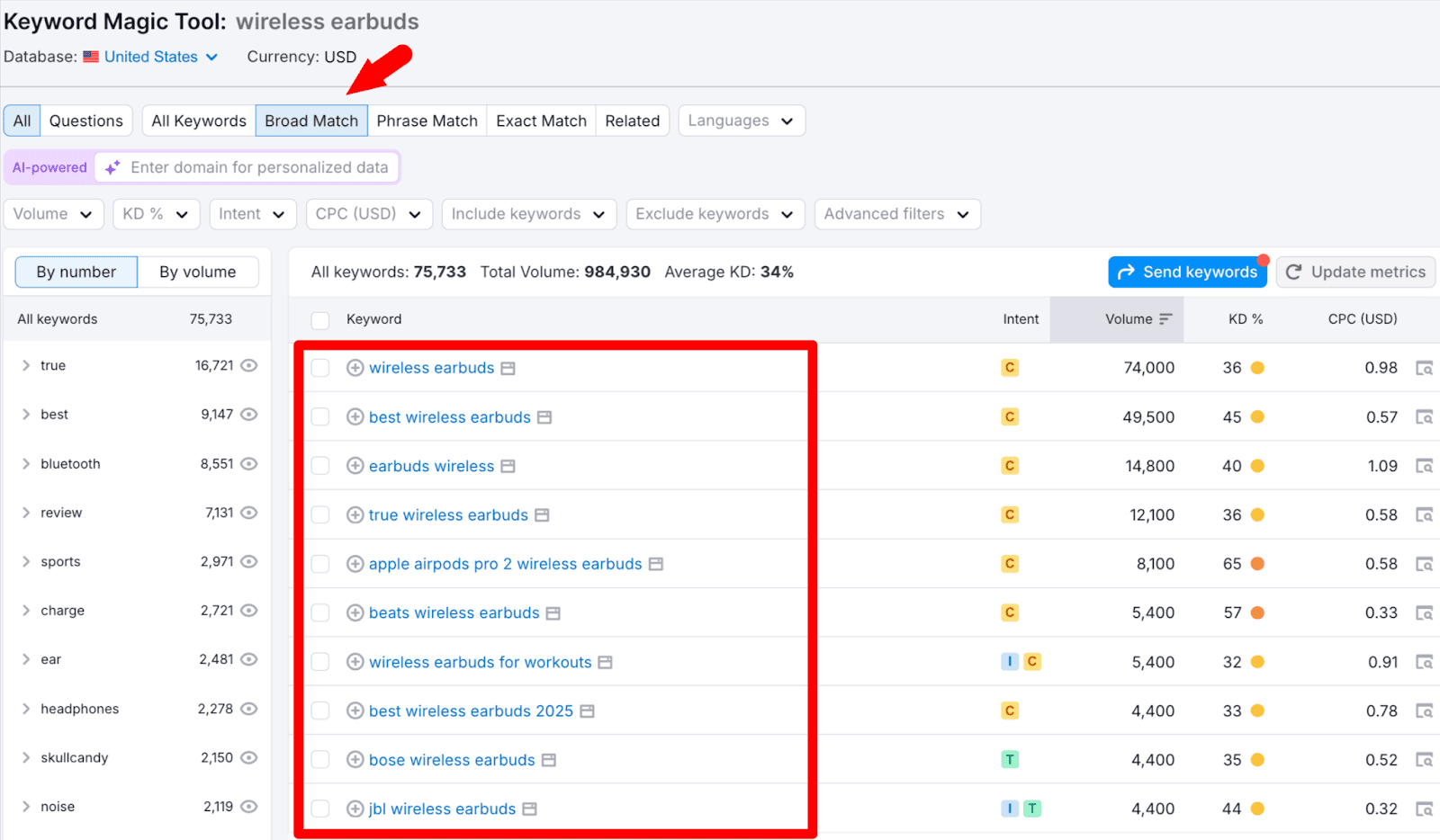 Le mot-clé seed doit être large. Par exemple, si vous êtes intéressé par les produits pour écouteurs, vous pouvez entrer « écouteurs sans fil » comme mot-clé de départ.