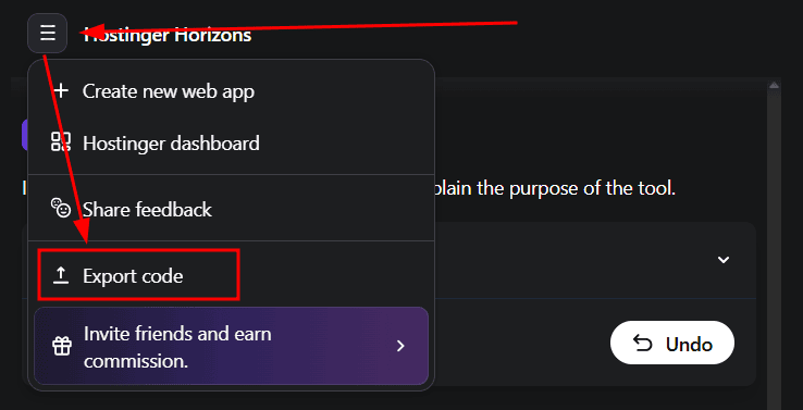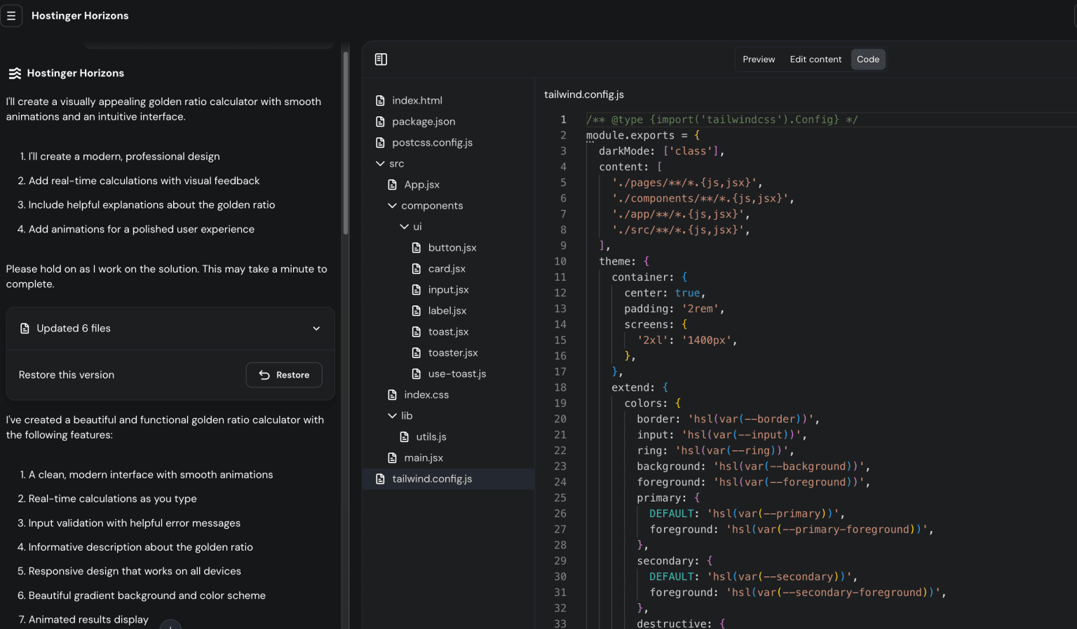 Déploiement en un clic : Une fois que votre application est prête, vous pouvez la publier en un seul clic via Hostinger Horizons sans aucun problème technique. Vous avez également la possibilité d’exporter les fichiers de projet, y compris HTML, CSS et JavaScript, vers votre ordinateur.