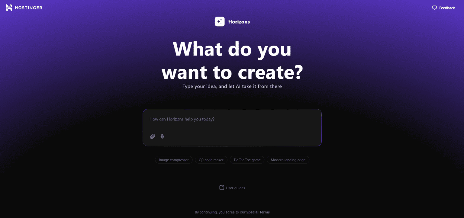 Dès que j’ai rejoint Hostinger Horizons, j’ai atterri sur le tableau de bord qui avait une zone de texte IA au centre où l’on pouvait entrer des invites.