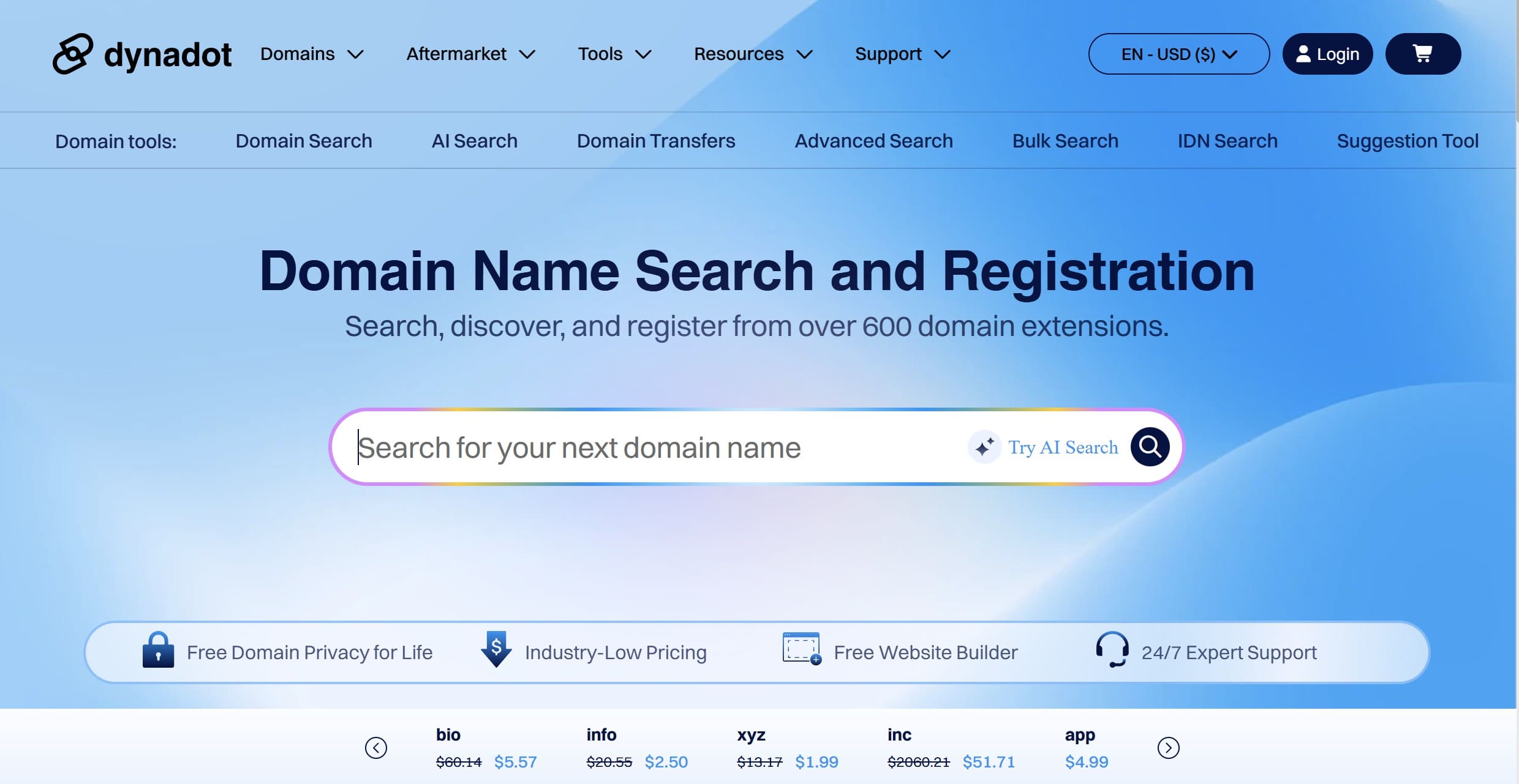 Dynadot est discrètement devenu l’un des registraires de domaines les plus puissants du marché. Leur tarif est constamment compétitif, surtout pour des extensions comme .biz, .co, .info, .io et .xyz. Ils incluent également une confidentialité de domaine gratuite et maintiennent leur plateforme propre et facile à utiliser. Ce ne sont peut-être pas les marques les plus tape-à-l’œil, mais si vous tenez à la valeur et aux coûts à long terme, Dynadot se démarque.