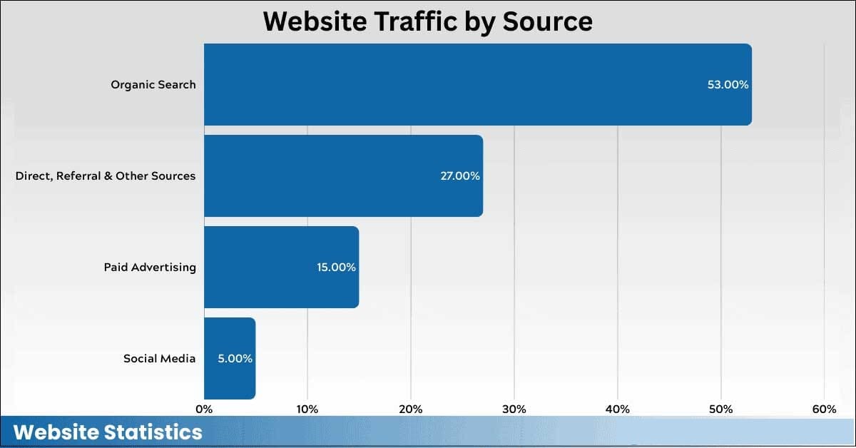 Plus de la moitié de toutes les visites de sites Web traçables (53 %) proviennent de la recherche organique, ce qui en fait la plus grande source de trafic. Il surpasse de loin les canaux directs, payants et sociaux.