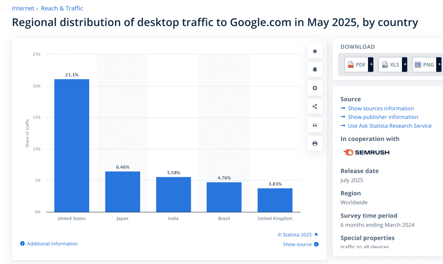 En 2025, la plupart des visites sur Google.com provenaient des États-Unis (21,1 %), suivis du Japon (6,46 %), du Brésil (5,58 %) et de l’Inde (4,76 %), ce qui indique que quelques pays clés génèrent la plus grande part du trafic mondial de Google. (Statista)